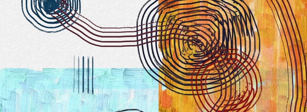 Líneas y formas circulares que se desplazan sobre bloques de color, una representación del movimiento.